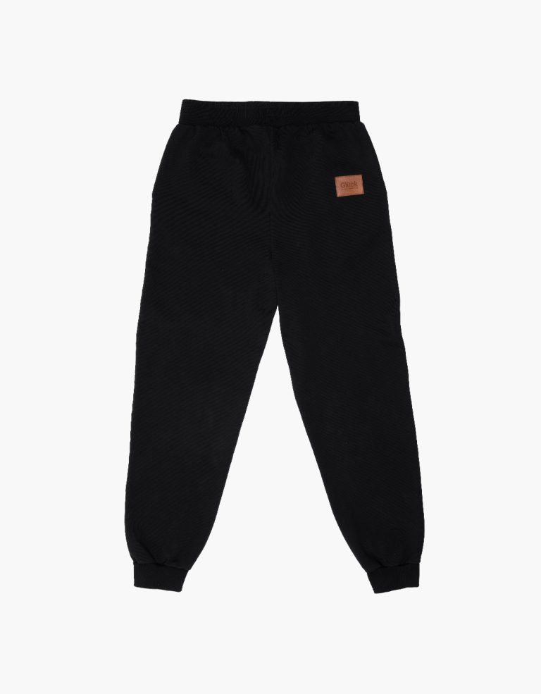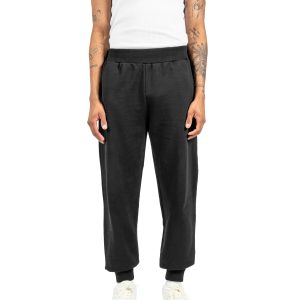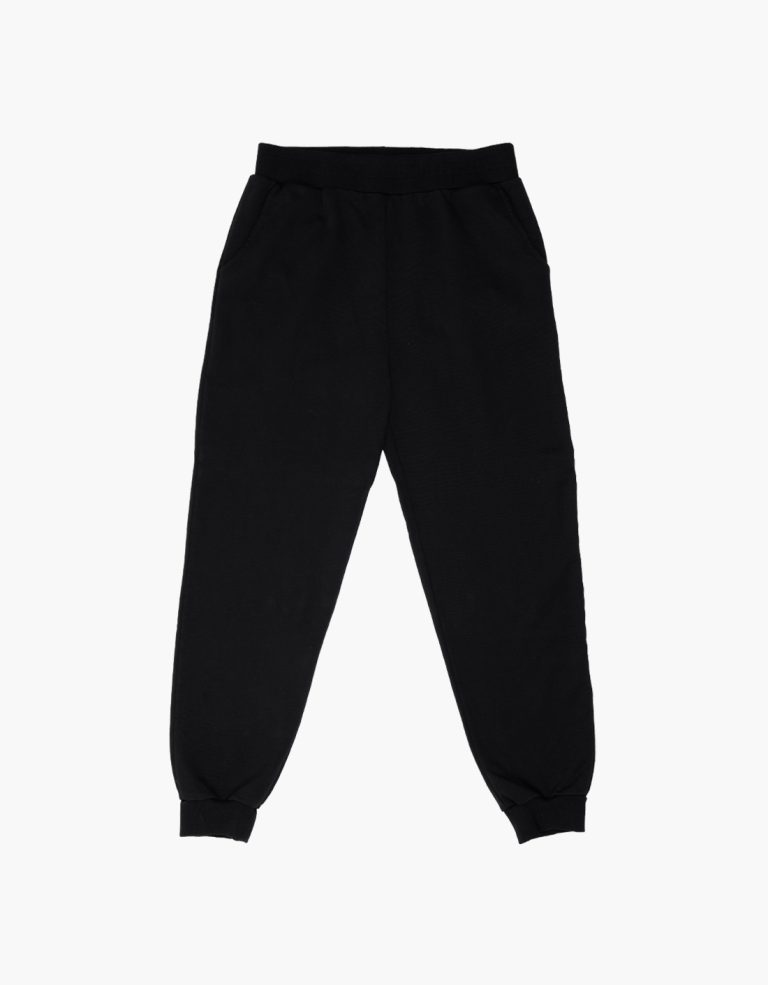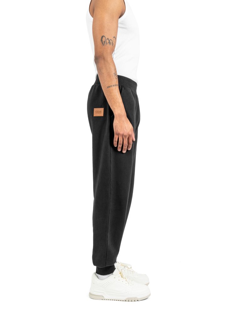 Sweatpants in black, made from 100% combed cotton diagonal fleece, 300gsm. Regular fit, elastic waistband, 2×2 rib cuffs, two front pockets, and a brown leather patch with the embossed brand logo on the back right side.