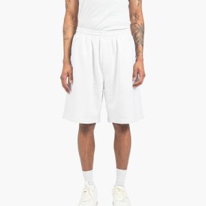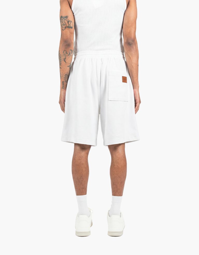 Shorts in white, made from 100% combed cotton diagonal fleece, 300gsm. Diagonal knit structure at the front, oversized fit, elastic waistband, 2 front pockets, and 1 back pocket with a brown leather patch detail embossed with the brand logo.