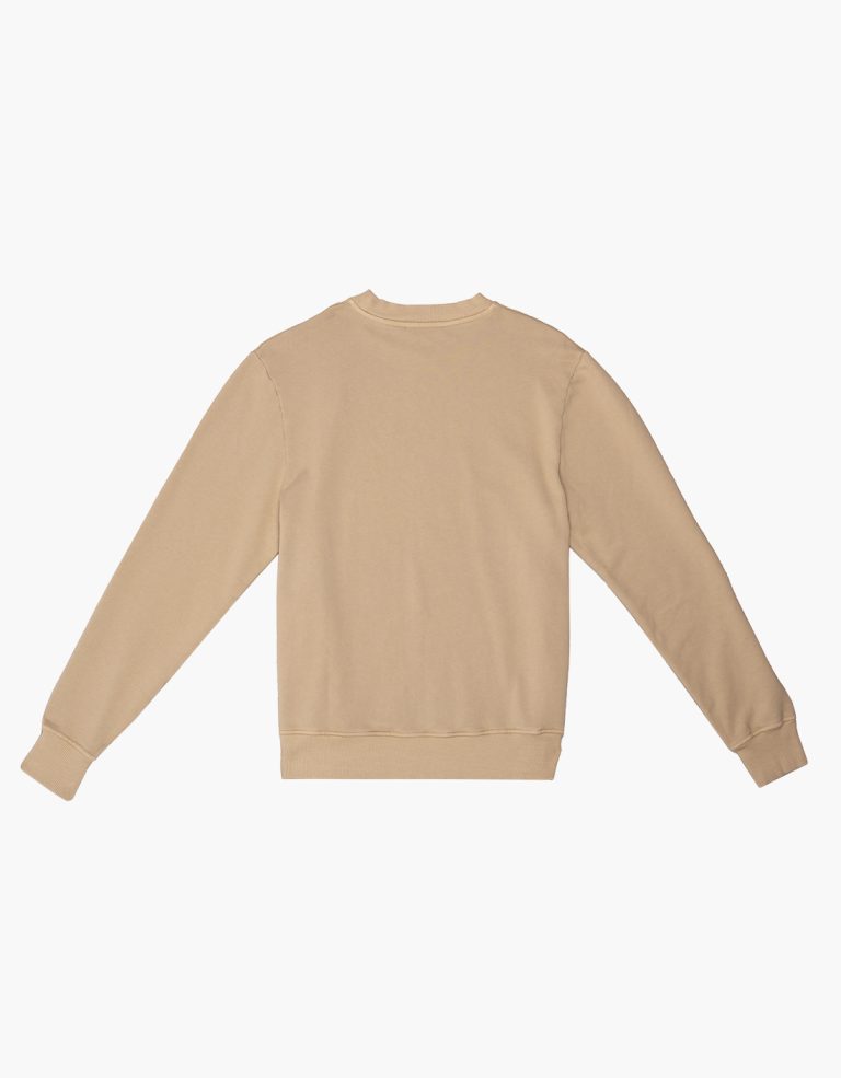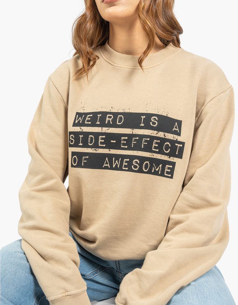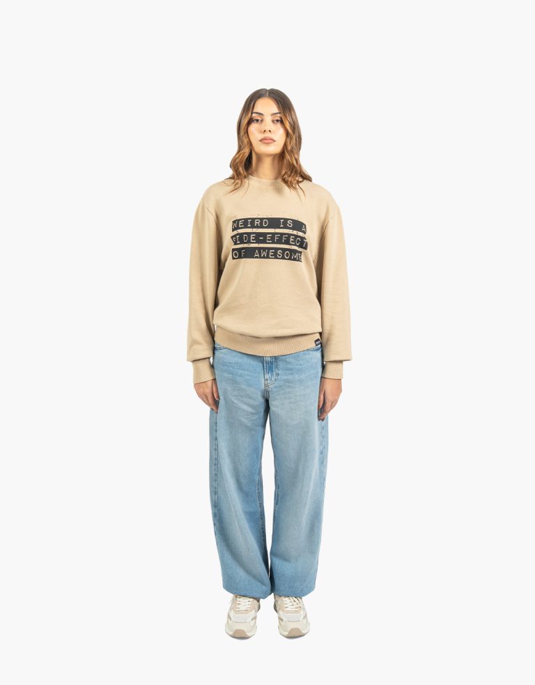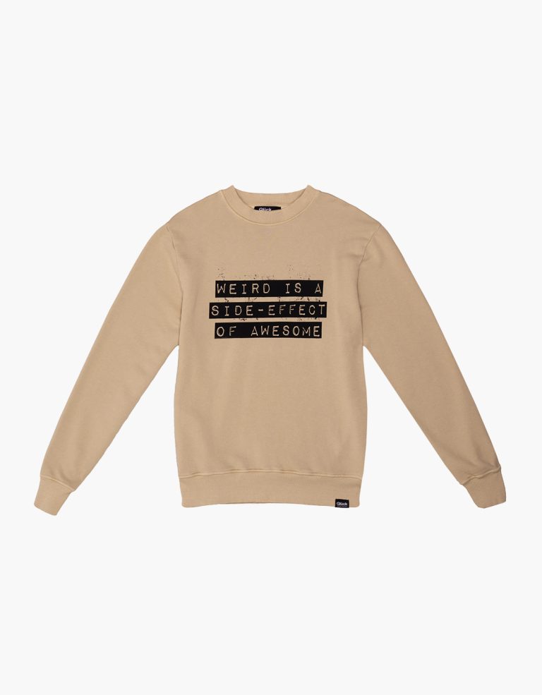 Sweatshirt Weird in mokka with a black digital print on the front, made from 100% combed cotton diagonal fleece, 300gsm. Regular fit, 2×2 rib at the neckline, cuffs, and hem.